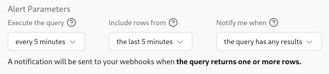 You can adjust when alerts are sent based upon the alert parameters. With this style of alert, we just want to know if anything within the last 5 minutes has been slow. So we can use the following options: