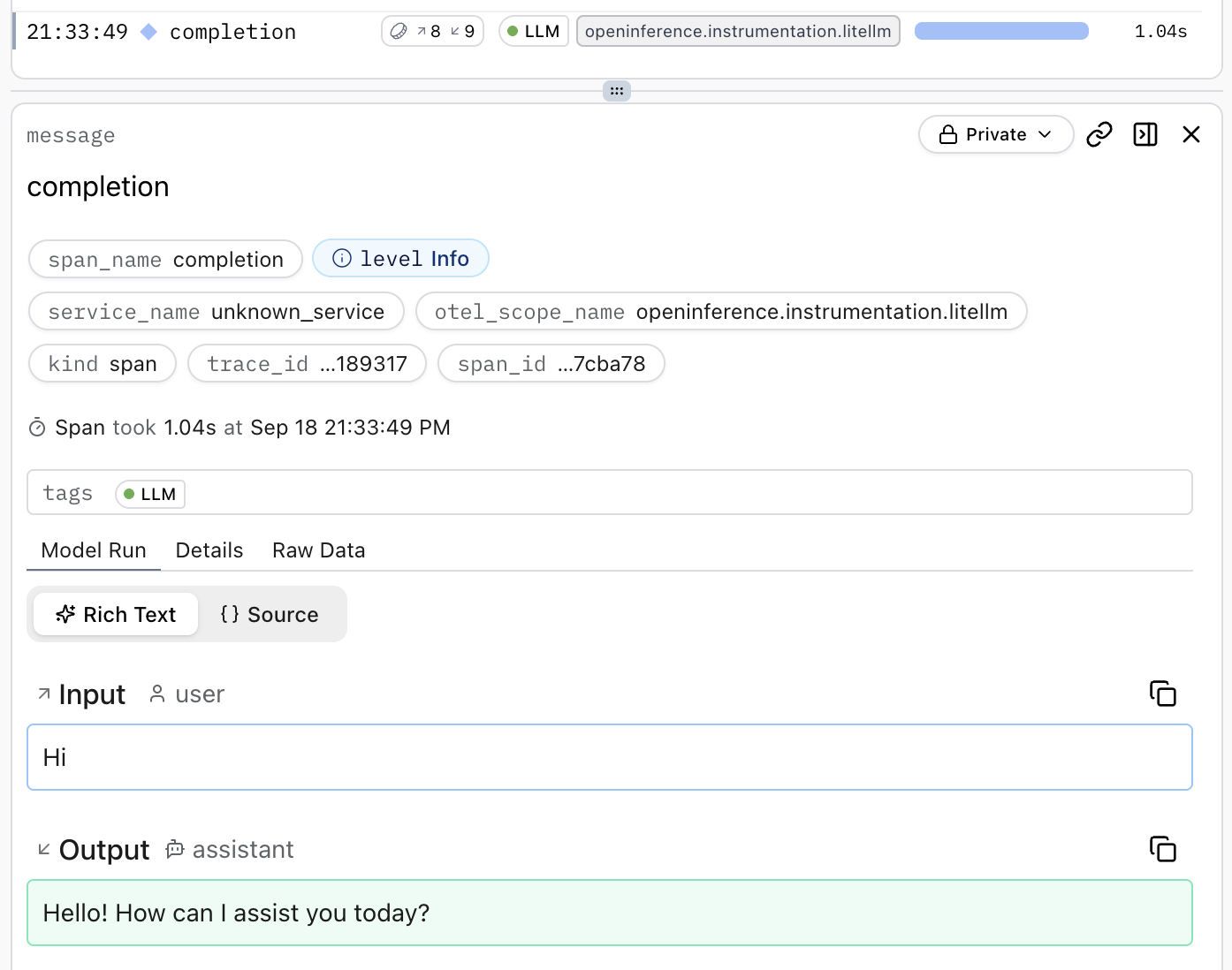 This currently works best if all arguments of instrumented methods are passed as keyword arguments, e.g. litellm.completion(model=model, messages=messages).